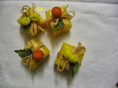 ho realizzato queste saponette mignon abbellite..... possono essere regalate come pensierino o utilizzate come chiudi pacco. E che ne dite di presentarle chiuse in un celofan a caramella.......
