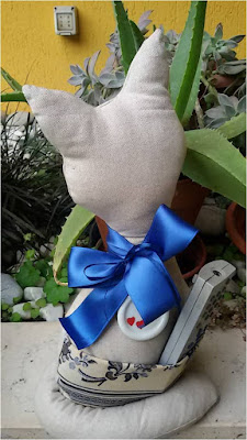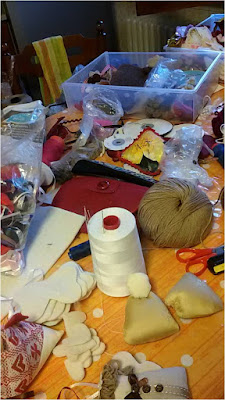 per realizzarlo servano avanzi di stoffe, di pannolenci, nastrini, bottoncini, imbottitura, colla a caldo...ecc...Di solito lavoriamo assieme dal momento di imbottire. In questo caso ho tagliato poi cucito le testine ed il vestitino che fa anche da corpo, assieme a Mirella ed Anna poi messo l'ovatta e chiuso l'apertura. I fiorellini sono realizzati da Mirella ed Anna.