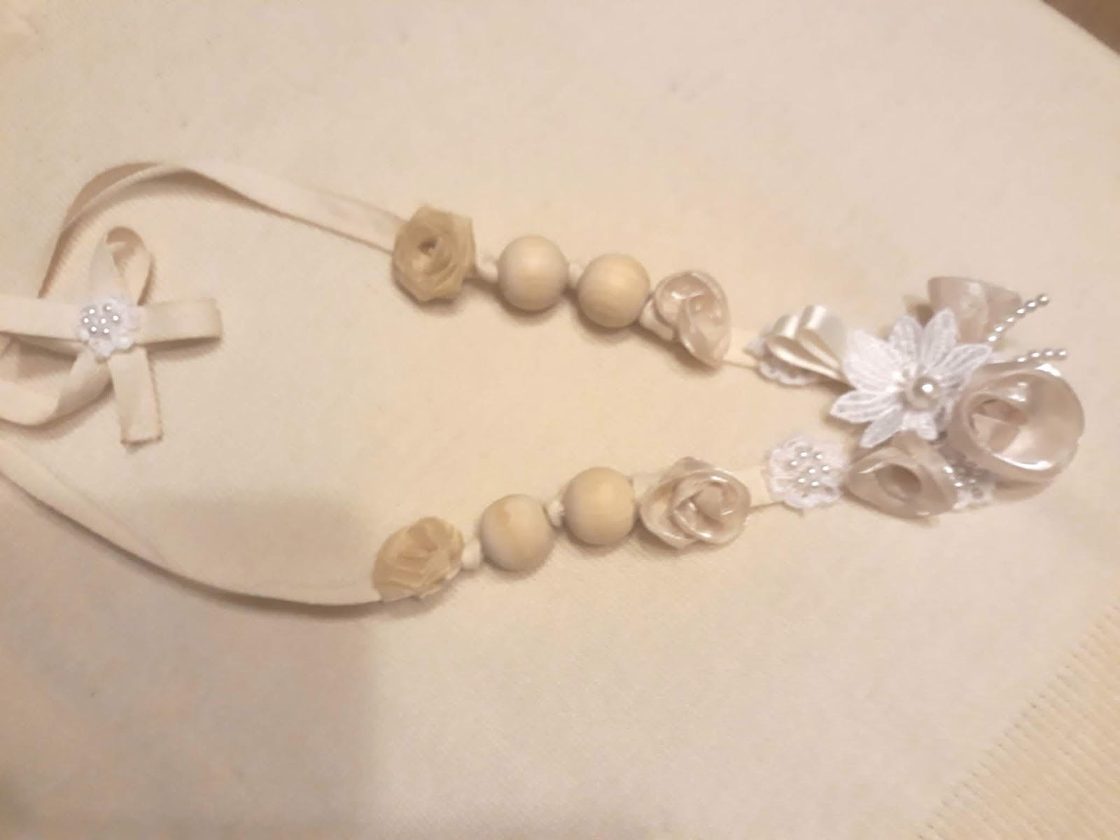 Ho realizzato una collana con una fettuccia in cotone, palline in legno naturale, fiorellini in tulle fatti a mano, fiori in macramè perline e nastrini raso....