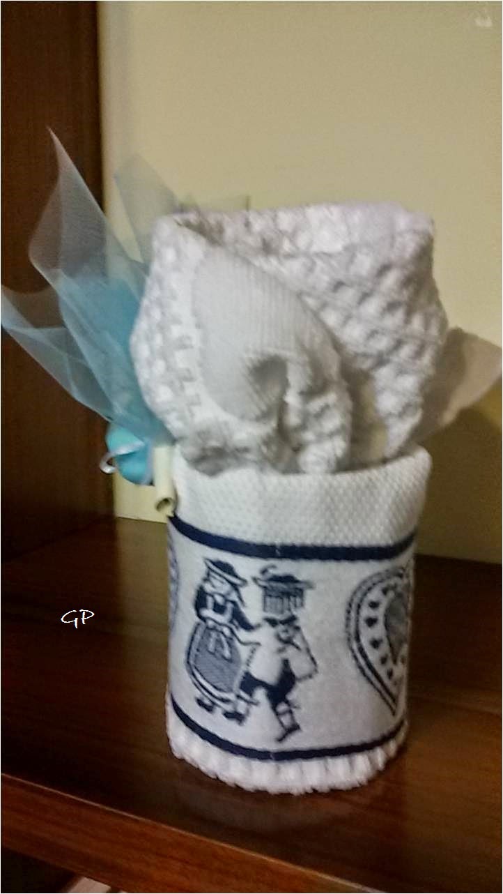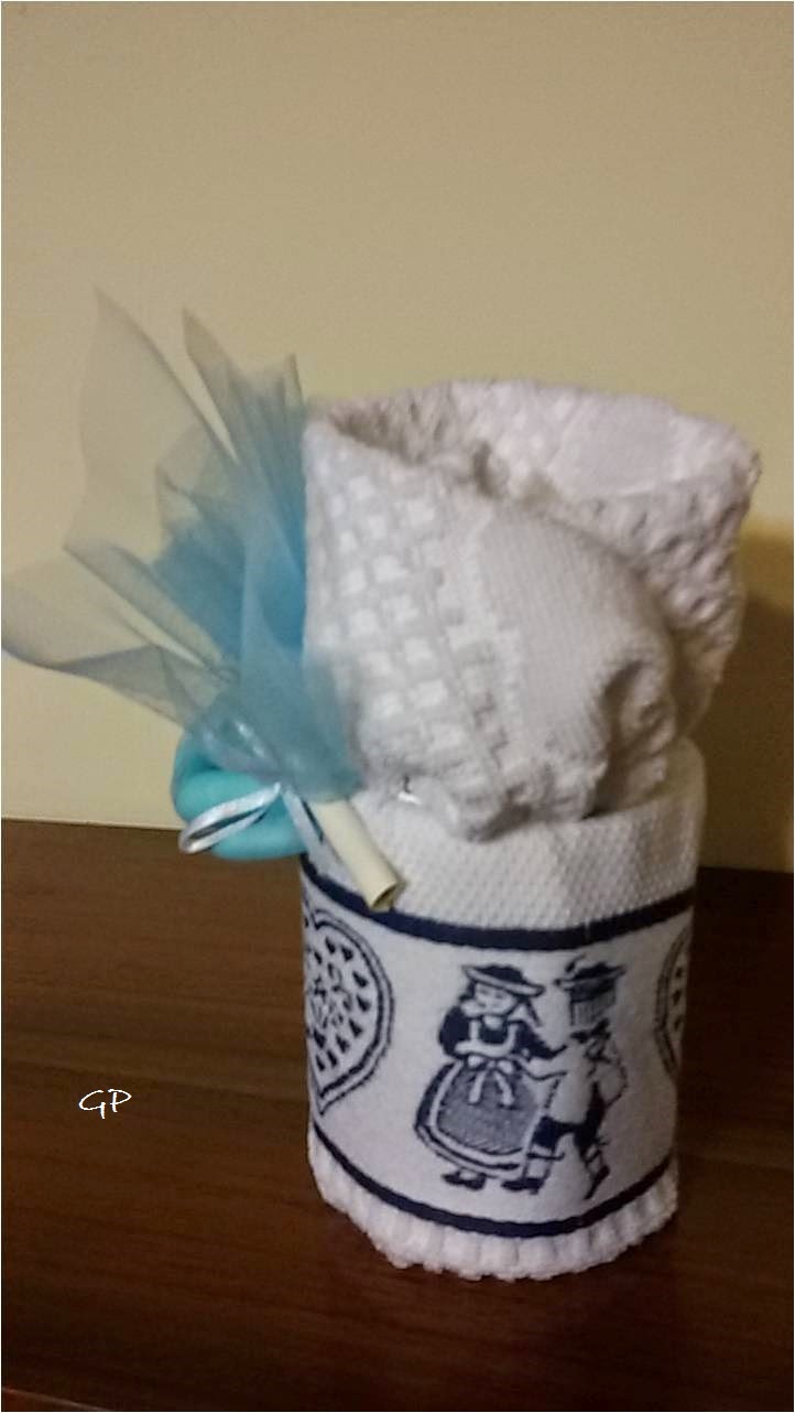 Realizzate con lavette in spugna cm 30x30.........all'interno una saponetta profumata rigorosamente inserita su una bustina in carta trasparente. Fiorellino al centro realizzato a mano in pannolenci..nastrini in gradazione e piccola pergamena con la scritta della scelta solidale. Confetti all'esterno....