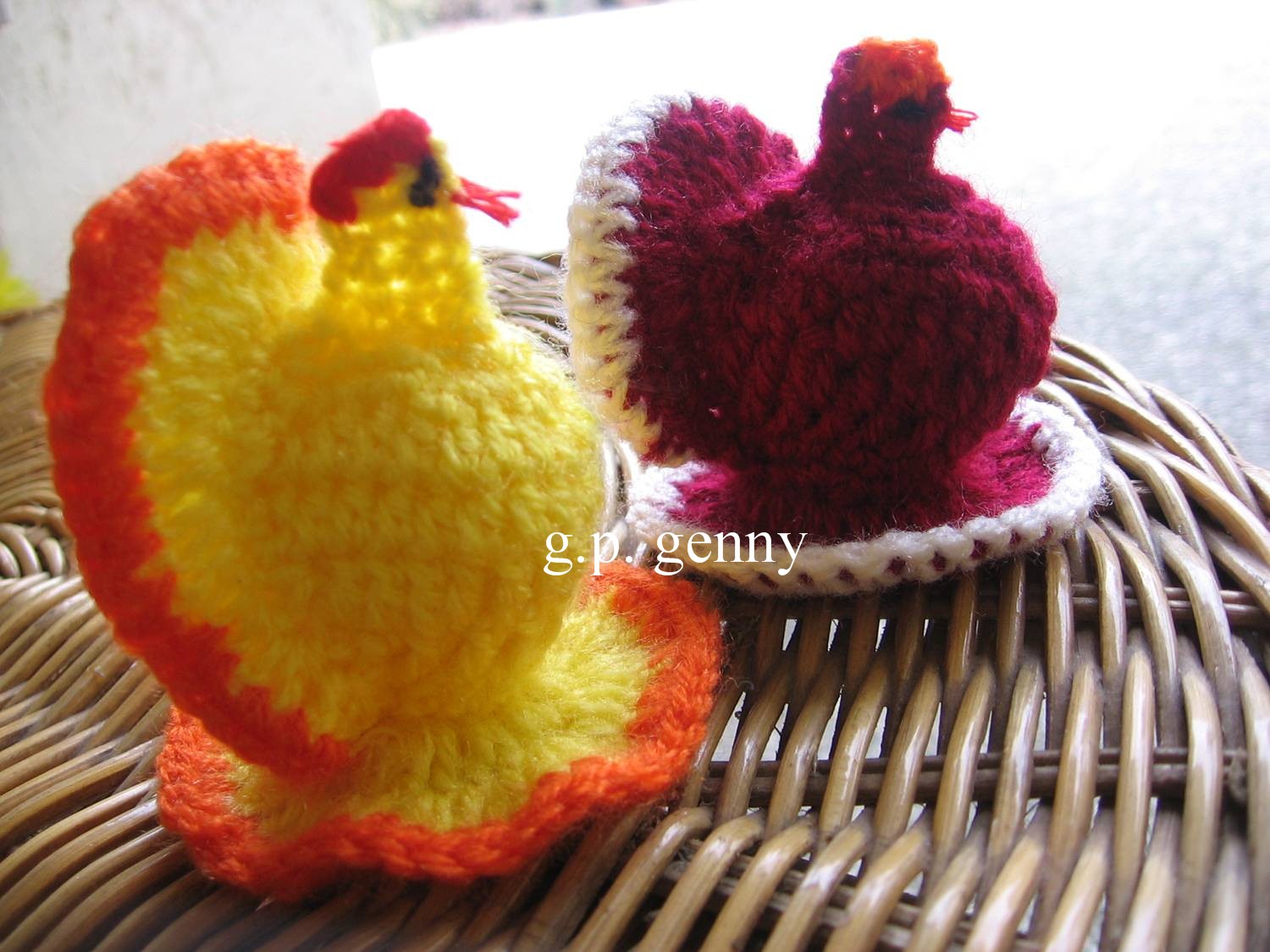 gallinelle fatte con avanzi di lana all'uncinetto con punto basso, alto e mezzo punto. Mi ha insegnato a farle la mia amica Mirella. Abbiamo pensato di farne diverse per la festa dei fiori che viene prima di Pasqua....