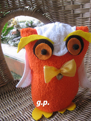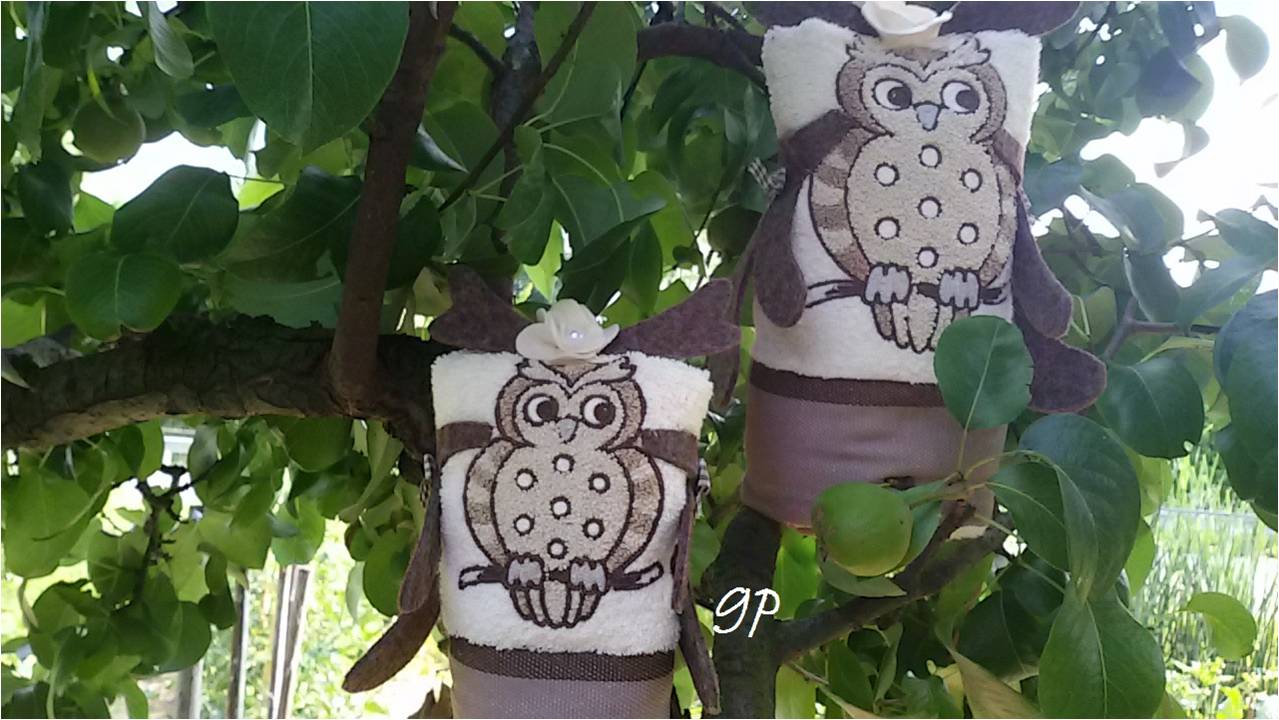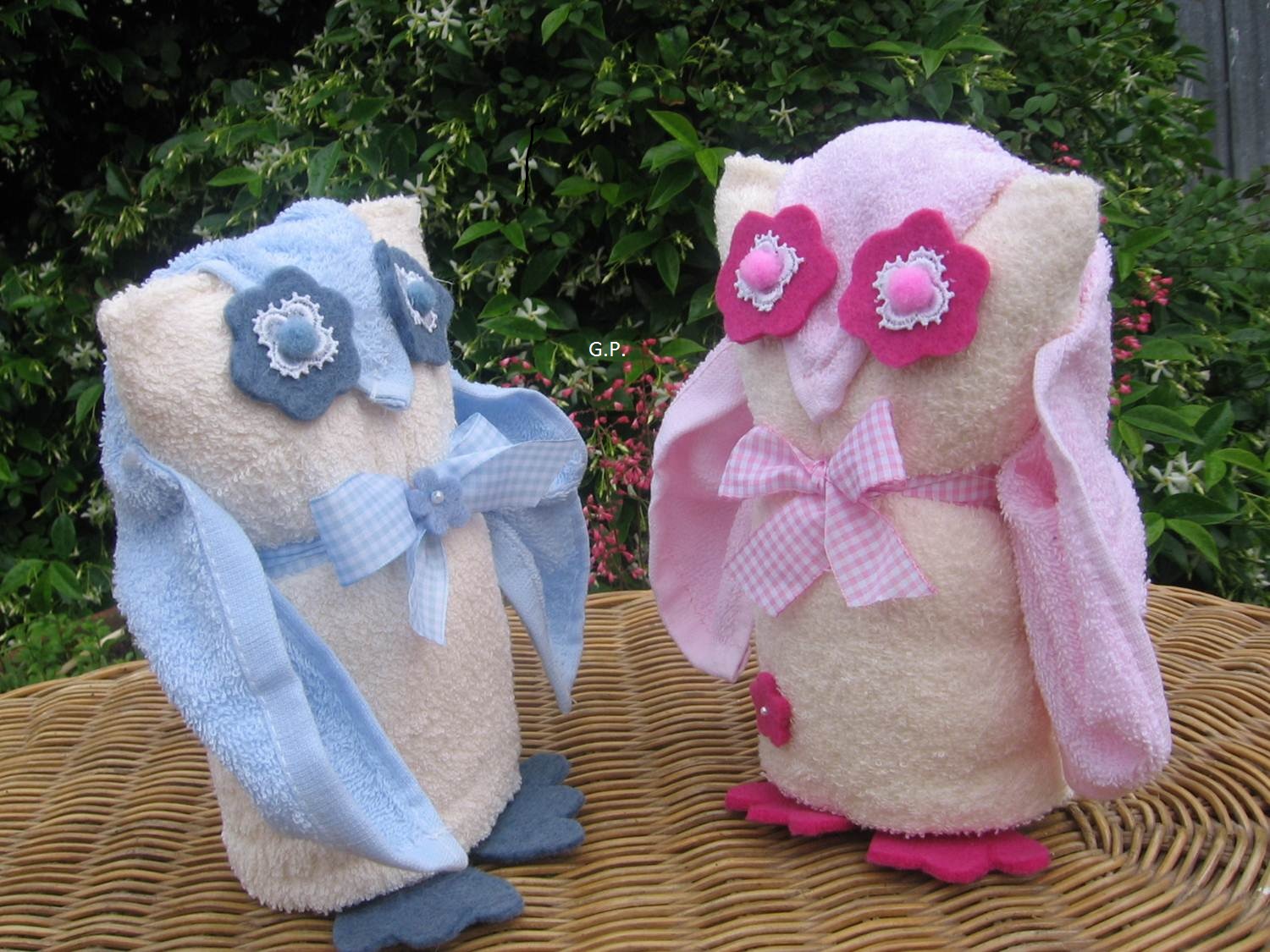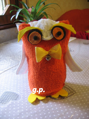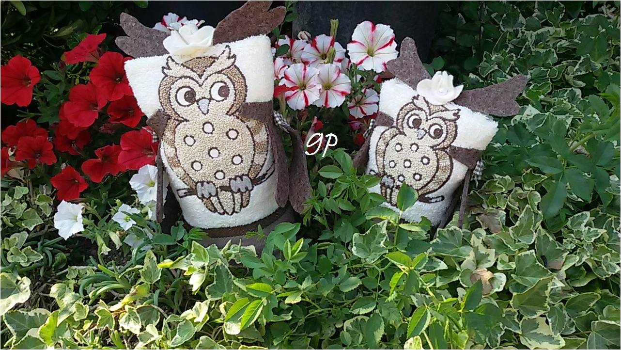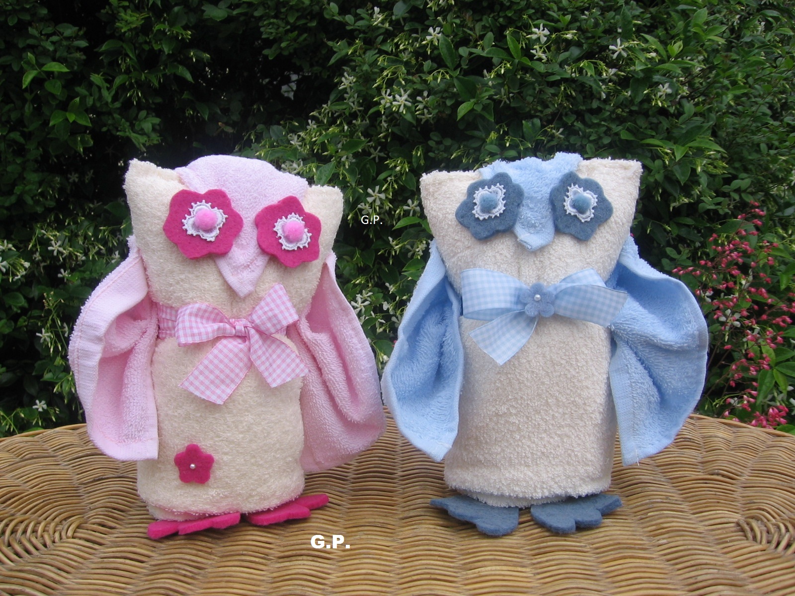Ecco realizzati due gufi o meglio due gufette ....asciugamani arrotolati ed abbelliti con feltro, pannolenci, nastri. perline....tutti gli abbellimenti sono attaccati con puntini a mano per non rovinare l'asciugamano e un domani poterlo utilizzare tranquillamente. Può essere un simpatico regalo......che ne dite?